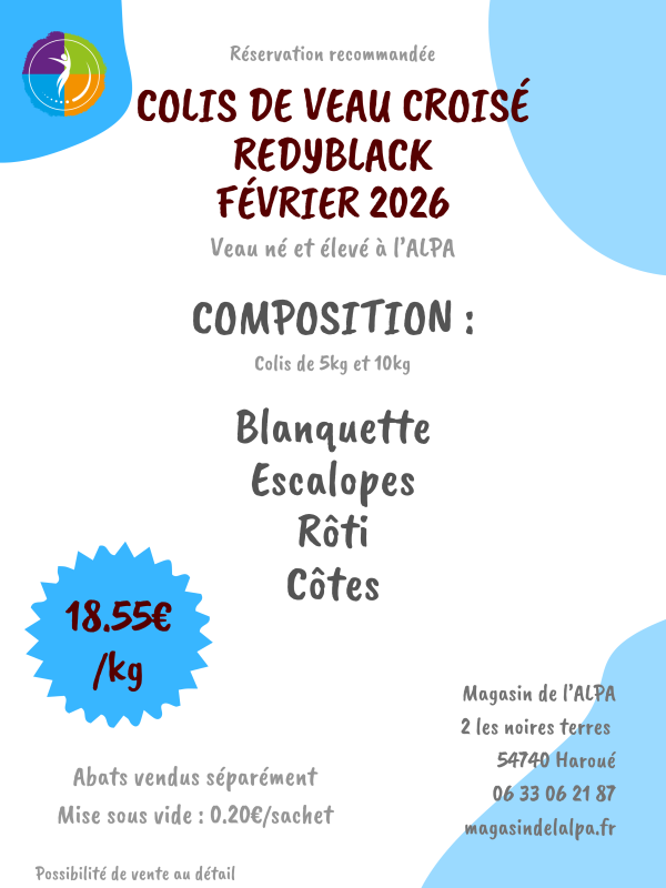 Les colis de veau seront disponibles en février 2025 (date à définir), nous vous contacterons lorsque votre commande sera prête